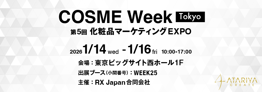 関連会社のアタリヤクリエイツ株式会社は2026年1月14日(水)〜16日(金)に東京ビッグサイトで開催されるCOSME Week 2026 Tokyo『第5回 化粧品マーケティングEXPO』に初出展いたします。